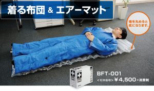 そこで・・・2014年9月26日にKING JIMさんから発売されたのが『着る布団&エアーマット』!!!! こちらの商品は、 災害時にオフィスや避難場所で待機する際、簡単に脱ぎ着しやすく着たままでも身動きが取れる人型の寝袋と、布団代わりになるエアーマットがセットになって います。 しかもA4ファイルサイズのボックスに収納されているので、本棚、書庫、引出しで保管できるのです。普通の寝袋だとそうはいきませんもんね。