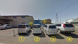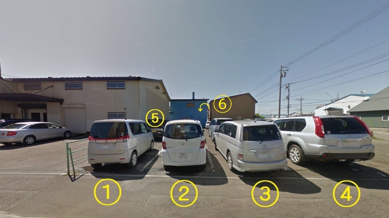 建物の向って右側に契約駐車場があります。①~⑥のいずれかをご利用下さい。