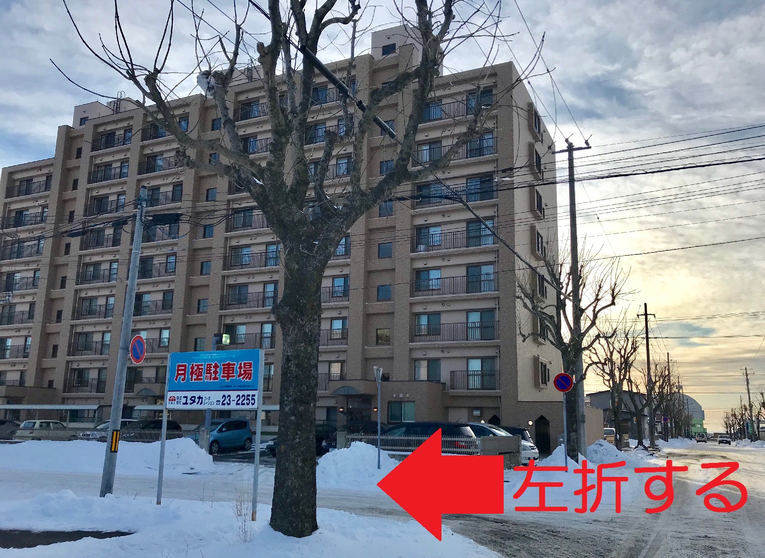 右折すると正面にマンションがあるので、その手前を左折します。