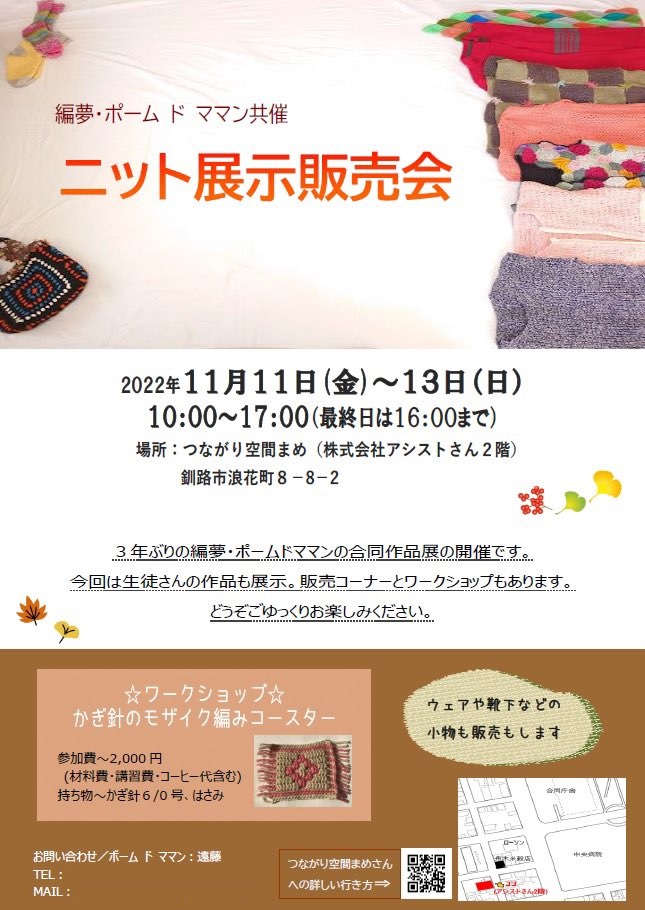 釧路市内で編み物教室を開いている「編夢」さんと「ポームドママン」さんによる編み物作品の展示販売会です。