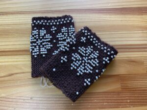 初めて見たのはリストウォーマーそのものじゃなく編み方。ビーズニッティングと言って、ビーズを毛糸に通して模様を作る編み方の作品を初めて見たのです。もう大興奮!