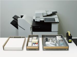 「オキブング」は、オフィス内で使うカッター・はさみ・ステープラーやその針などを社員が個別に持つのではなく共有コーナーに置いて共同で使う!という考えのもとに開発された商品です。