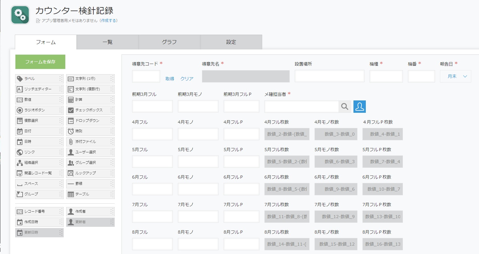 ↓お客様名と月別検針値欄を用意して、使用枚数欄には計算式をセットしました