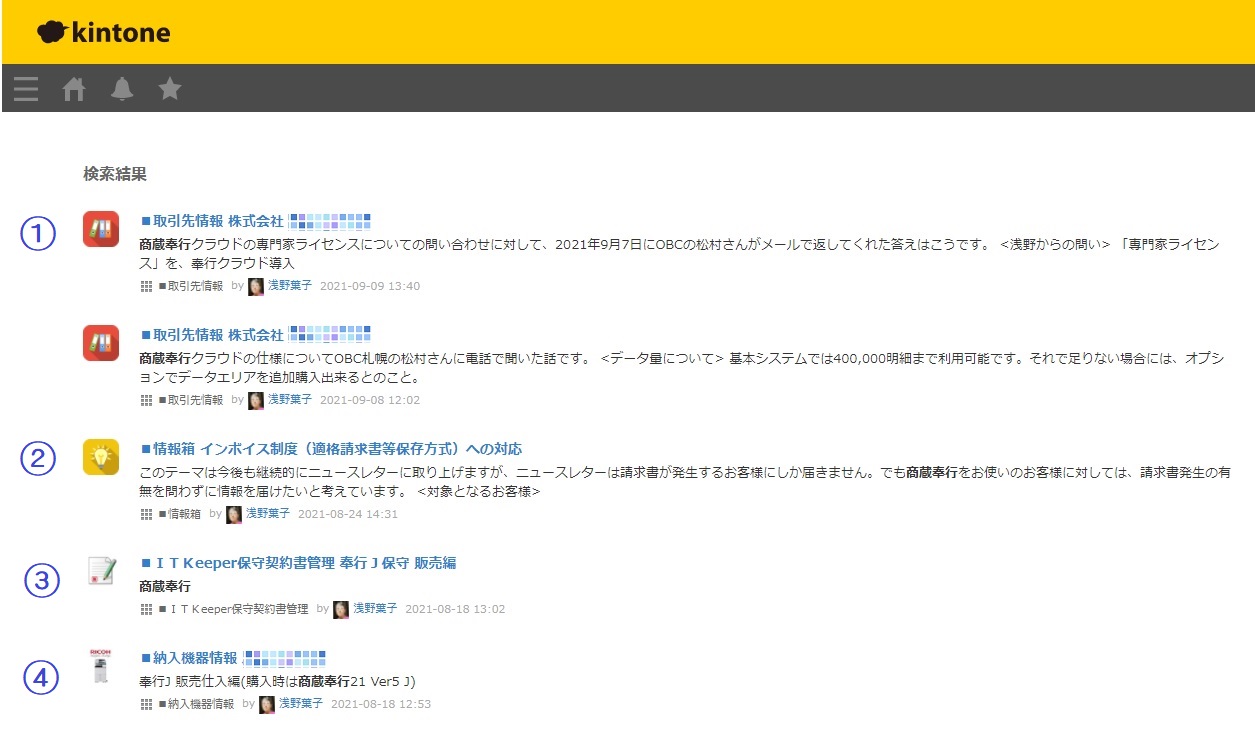 情報を紙ファイルや書庫に保管していた時代は「この情報はココにある」と保管場所を記憶しておく必要があって、ある程度の経験が無いと必要な情報にたどり着くまでに相応の時間がかかりました。でもkintoneならキーワードを入力するだけでいいのです。