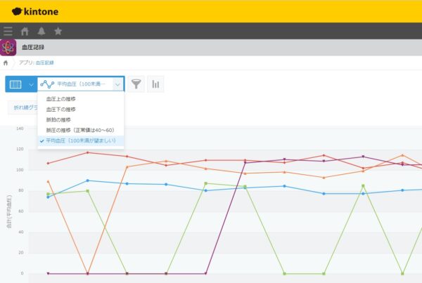 でも…出来ることなら毎日血圧を測って、記録して、体調の変化を知れたらいいなぁ。いい方法は無いだろうか…と考えたときに思い浮かんだのがアレ。一昨年、顧客管理のために導入したクラウド型の業務改善アプリ、サイボウズ社のkintone(キントーン)を使う方法です。
