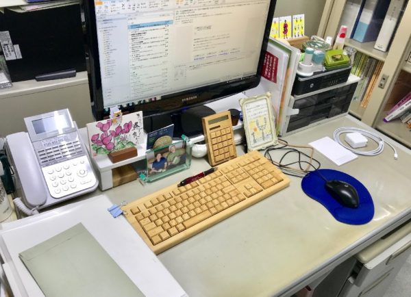 竹製の電卓、木製のスマホスタンド、木製のカレンダー。卓上小物も自然素材で揃えて、柔らかで落ち着いた雰囲気になりました。
